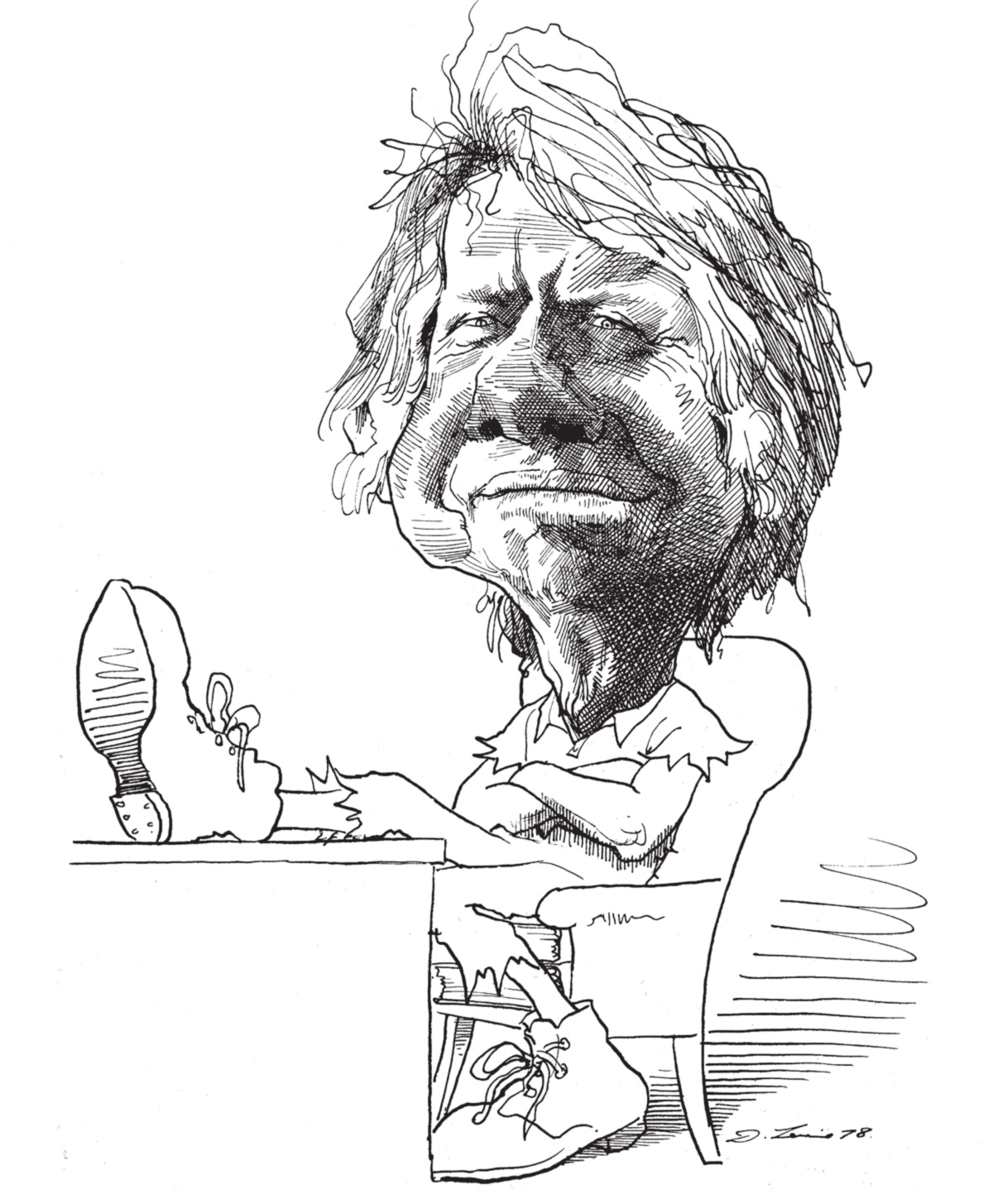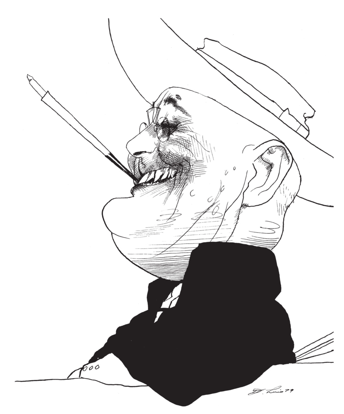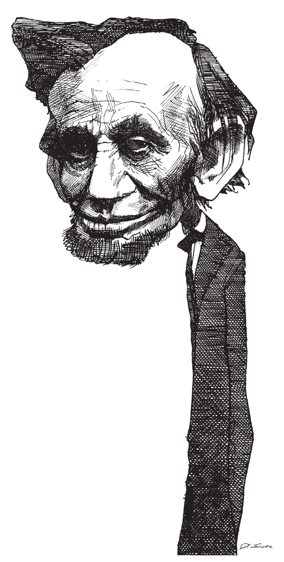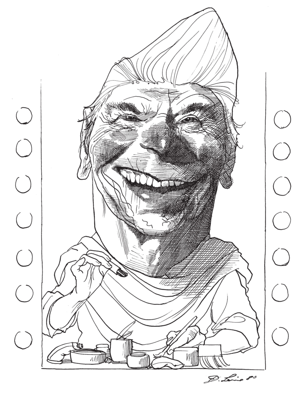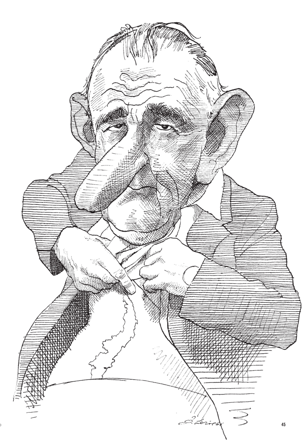 Para quem quiser ter uma idéia da incrível abrangência de sua obra, basta mergulhar em alguma das gavetas rasas da antiga mapoteca de madeira do seu ateliê, onde as caricaturas estão arrumadas por ordem alfabética. Abri na letra C, e lá estava Churchill: visto de costas, identificável apenas pela forma do corpo, sua paleta e seu charuto. Depois, numa ordem aleatória: Cheney (Dick). Carmichael (Stokely). Le Carré (John). Church (Frank). Carroll (Lewis). Castro (Fidel), em várias poses: uma como jogador de beisebol, outra brandindo uma foice. César e Calígula. Calhoun (John C.). Cunningham (Merce). Connolly (Cyril). Cuomo (Mario). Chirac. Von Clausewitz. Colette. Clifford (Clark). Chesterton. Cromwell. Chaucer. Clinton (Bill). Carlos V. Califano (Joe). Cheever. Carswell (G. Harrold). Colombo. Child (Julia). Cullen (Countee). Clark (Ramsey). Chomsky. Chateaubriand. Callas. Curzon (Lord).
