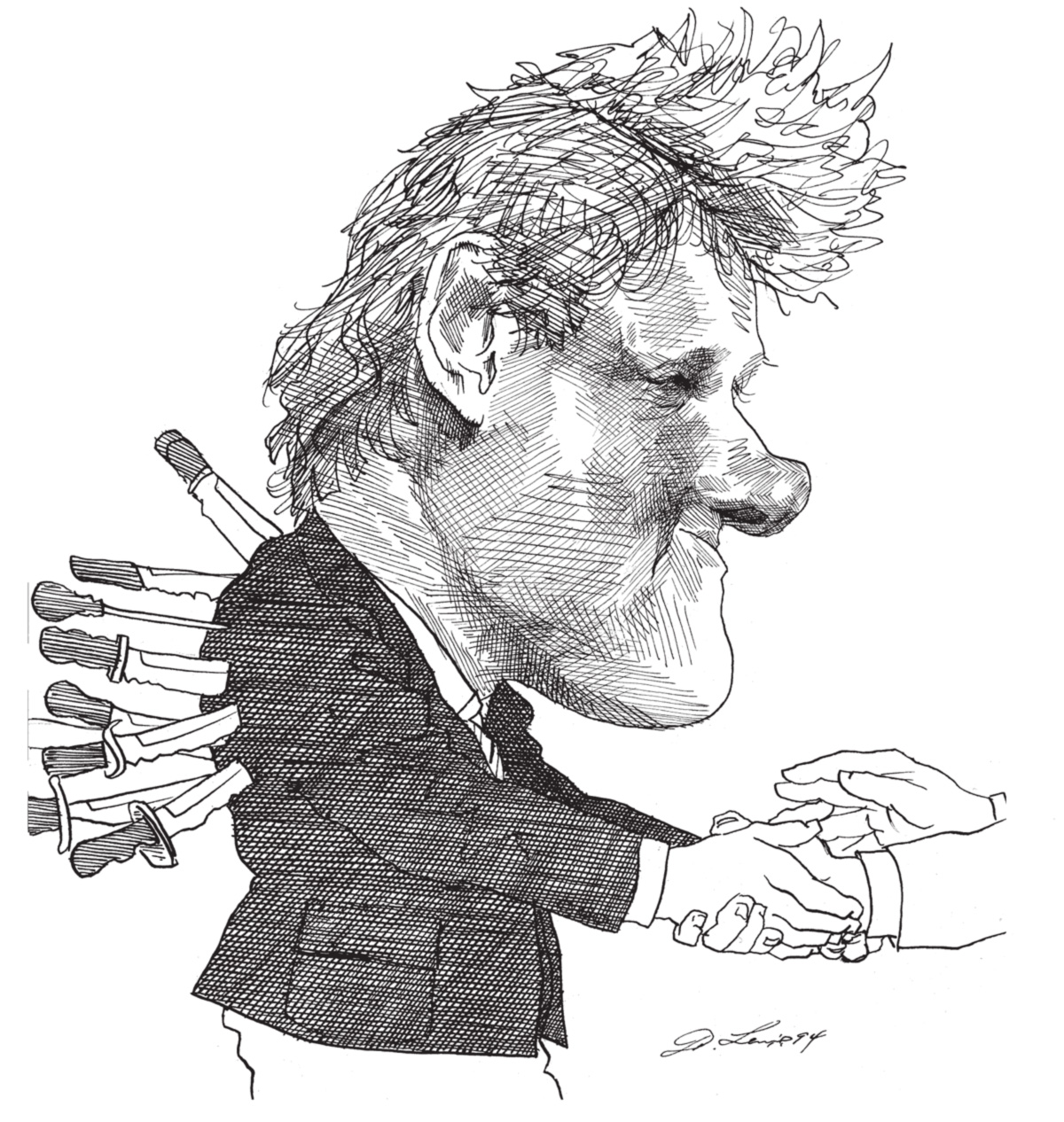 Em quase três décadas de Nova York, eu nunca tinha encontrado ou visto David Levine em pessoa. Sabia pouca coisa a seu respeito. Mas por degustar o seu trabalho na Review a cada quinzena, anos a fio, o considerava uma figura familiar, quase um amigo. Quando sua produção começou a ficar mais esparsa, e depois desaparecer por completo das páginas da Review, fiquei intrigado. Alguém mencionou que ele estava doente, mas nunca li nada a respeito na imprensa. Em março passado, compareci a uma homenagem a outro grande iconoclasta do jornalismo, o falecido I. F. Stone, e lá estava Levine. Ele tinha caricaturado Stone, é claro – pelo menos três vezes. Uma das versões foi publicada na capa de uma coletânea dos artigos de Stone. “David Levine!”, exclamei. “Tenho sentido a sua falta! Está tudo bem?”