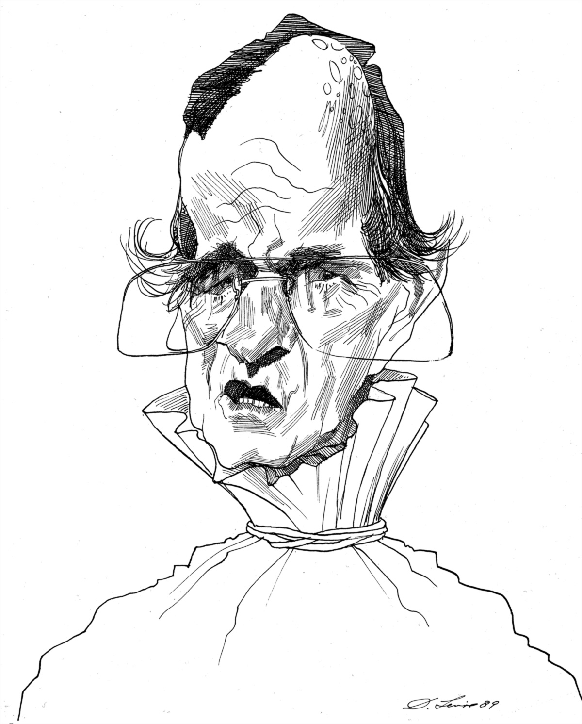 Basta digitar um nome qualquer na “David Levine Gallery”, no site da Review, para encontrar uma quantidade impressionante de retratos: 66 Richard Nixon, 41 Lyndon Johnson, 23 Ronald Reagan, 16 Sigmund Freud, 14 Norman Mailer, 13 Charles de Gaulle, 12 Jimmy Carter, 11 Adolf Hitler, 10 William Shakespeare, 9 Jean-Paul Sartre, 8 Bertrand Russell, 7 Menachem Begin, 6 Ernest Hemingway, 5 Marcel Proust, 4 Khomeini, 3 Bernard Berenson, 2 Elvis Presley e 1… bem, são centenas e centenas de retratos. E boa parte do que saiu na Review sequer está arquivado no site. Sem falar dos desenhos feitos para outras publicações.