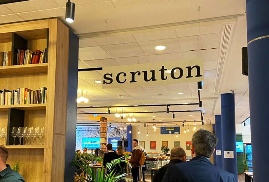 Até a lanchonete da Corvinus é alinhada: homenageia o pensador conservador britânico Roger Scruton. O simpósio era inteiramente gratuito para quem se inscrevesse, com direito a finger food. Ficou lotado.